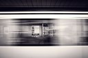 Eine schwarz-weiße Langzeitbelichtung zeigt einen einfahrenden U-Bahn-Zug an einem Bahnsteig. Die Bewegungsunschärfe des vorbeifahrenden Zuges lässt Werbeplakate an der Bahnsteigwand – darunter ein Aushang zum „XXXI Festival de Otoño" – nur schemenhaft erkennen. Der Bahnhofsname „Balboa" ist im Hintergrund zu lesen. Das Bild steht als dynamisches Symbol für urbane Mobilität und öffentlichen Nahverkehr.